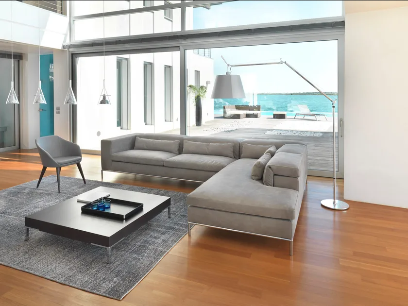 Секционный диван состоит из нескольких компонентов, включая основную секцию для сидения и шезлонг. Эта композиция позволяет создавать универсальные варианты размещения, что делает его подходящим как для небольших, так и для больших жилых пространств. Модульная природа дивана предоставляет гибкость для адаптации к различным планировкам и дизайнерским предпочтениям.
