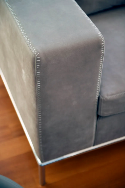 Дизайн секционного кожаного дивана с шезлонгом включает в себя яркие геометрические формы, которые привлекают взгляд. Внимание к деталям очевидно в тщательно продуманных линиях и роскошной отделке. Общая эстетика дивана одновременно привлекательна и элегантна, что делает его центром внимания в любой комнате. Декоративные элементы, такие как строчка и хромированная или бронзовая основа, подчеркивают его современный вид.