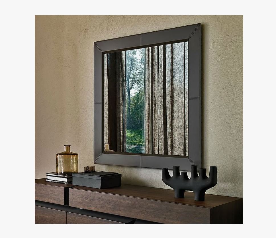 Зеркало прямоугольной формы, представлено в современном стиле итальянской фабрикой CATTELAN ITALIA, коллекции RED CARPET COLLEZIONE 2014. Рама обита кожей. Возможны различные варианты отделки - обивка кожей или отделка под серебро или золото. Также возможны различные формы зеркала.