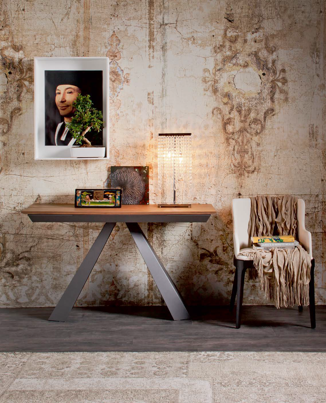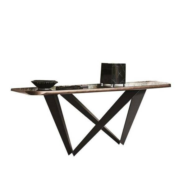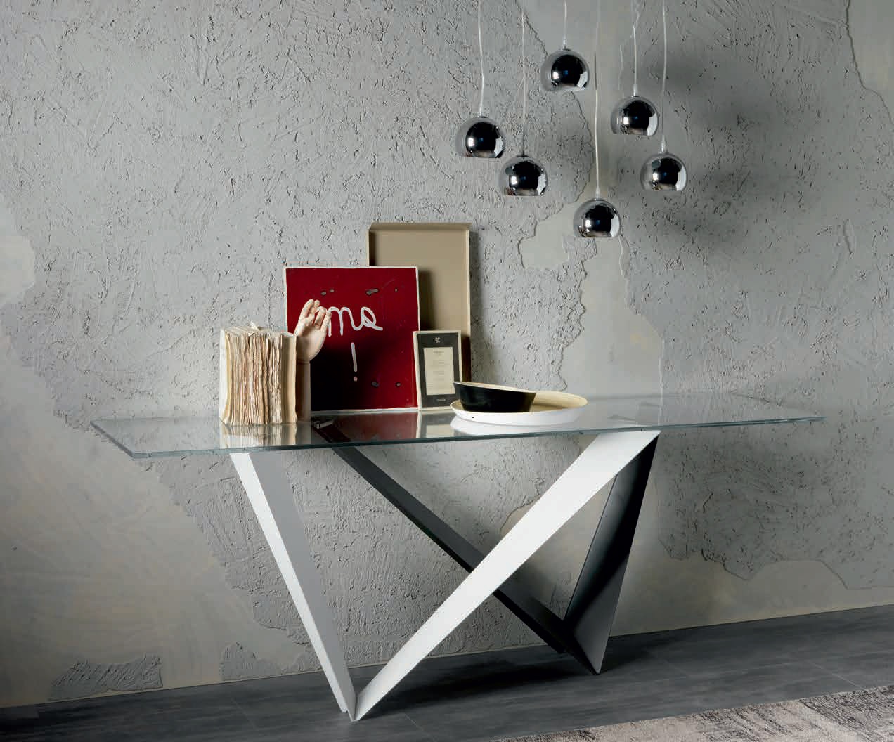 Консоль, представлена в современном стиле итальянской фабрикой CATTELAN ITALIA, коллекции RED CARPET COLLEZIONE 2014. Столешница выполнена из стекла, керамики также можно выполнить из дерева. Основание консоли изготовлено из стали и окрашено в белый и серый.