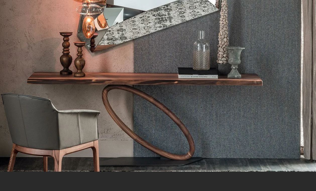 Консоль, представлена в современном стиле итальянской фабрикой CATTELAN ITALIA, коллекции BOOK 5 COLLEZIONE 2014. Столешница выполнена из стекла. На деревянной ножке в виде овального кольца и металическим основанием.
