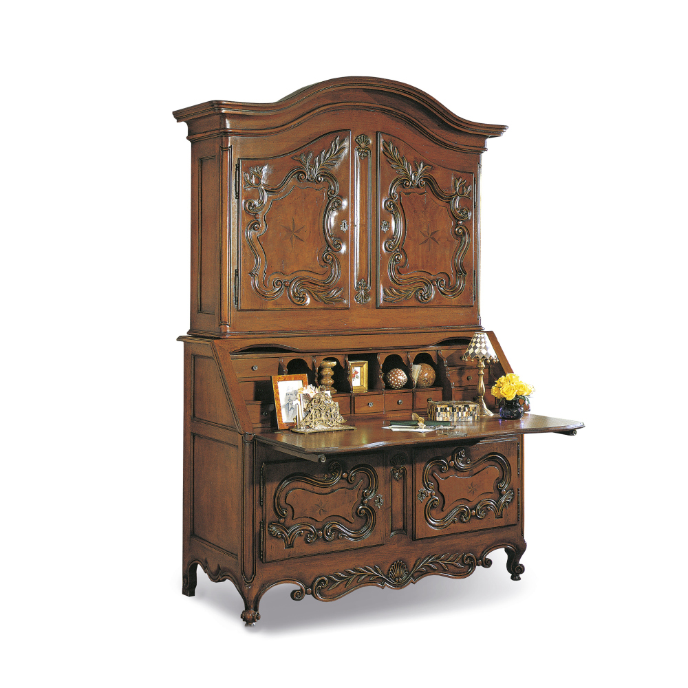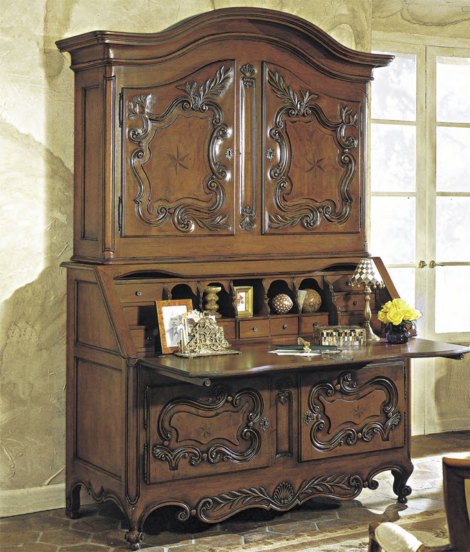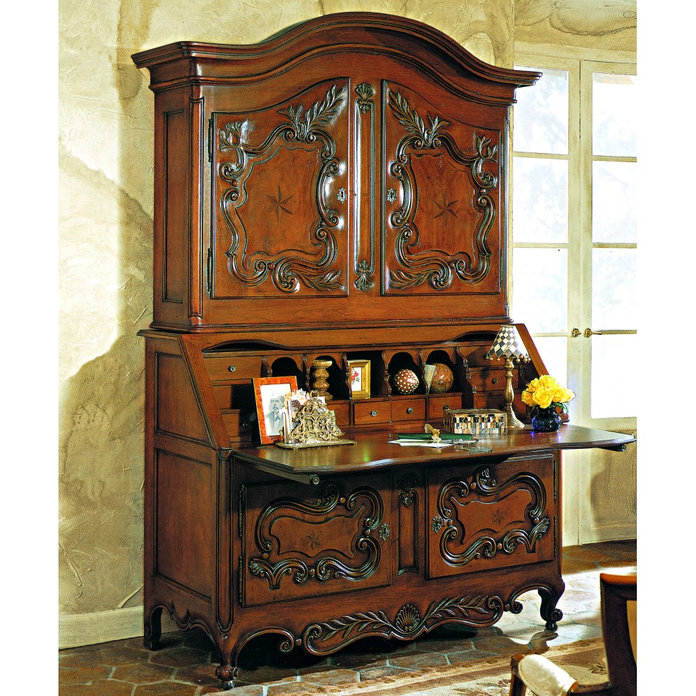 Секретер резной, изготовленный из массива дерева по особой технологии с четырьмя распашными дверцами инкрустированными вручную и одной откидной. Средняя секция представляет собой откидную столешницу, которая скрывает множество выдвижных миниатюрных ящичков и полочки. Секретер на четырех массивных, но изящных ножках. Декорирован резьбой. Возможны другие варианты отделки